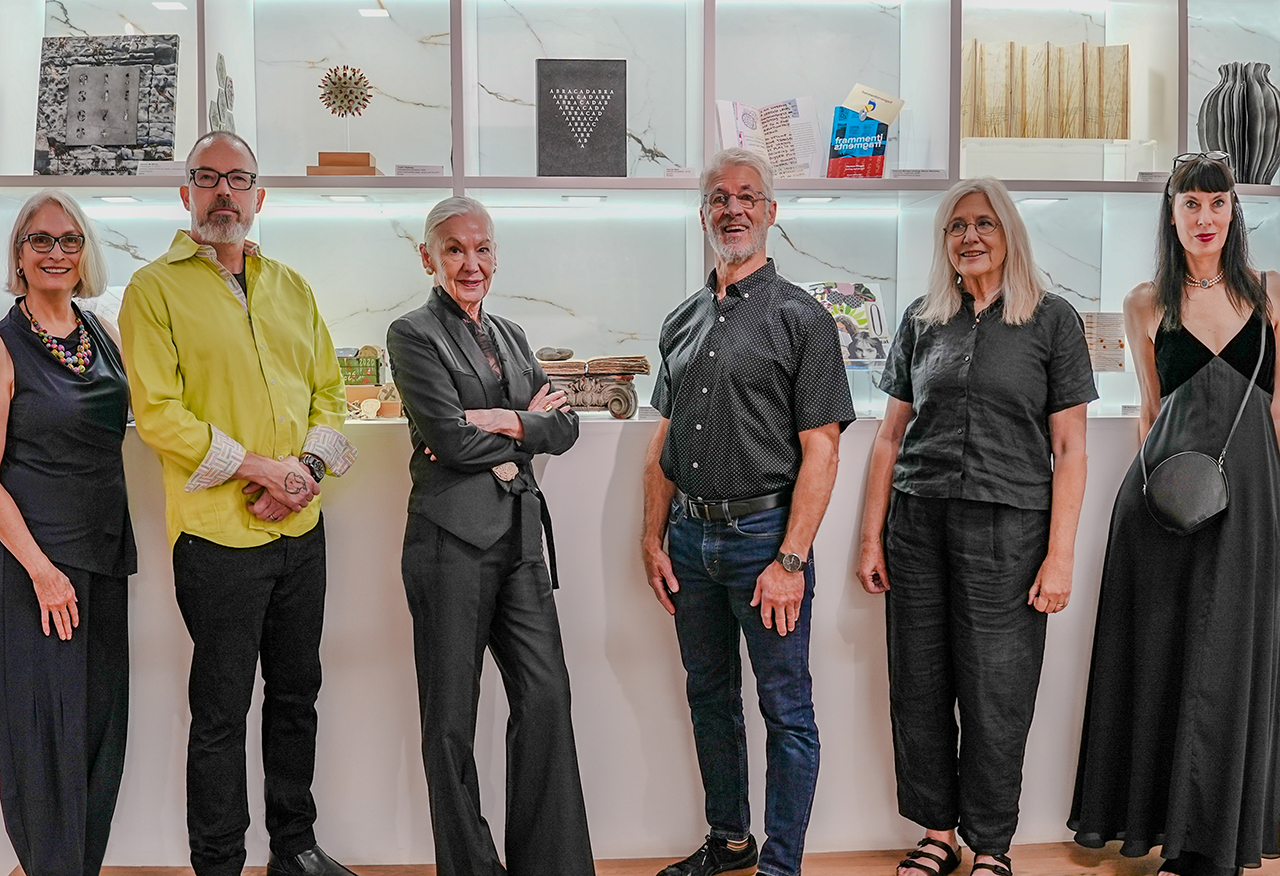 Volumes: Audacious Book Cooperative is a group of six multidisciplinary artists with a primary interest in the book. Based in Minneapolis–St Paul, Minnesota, USA, the mission of Volumes: Audacious Book Cooperative is to elevate the profile of the book arts in the public arena by increasing the visibility of the genre and one another’s work, by fostering creativity and community among like-minded book artists, by promoting and enhancing the book as an art form, and by expanding the audience base for artists’ books. Volumes: Audacious Book Cooperative’s inaugural event was a group exhibit at the Kickernick Gallery in Minneapolis that opened in September 2025 and runs through March 2026. Group photo below. |